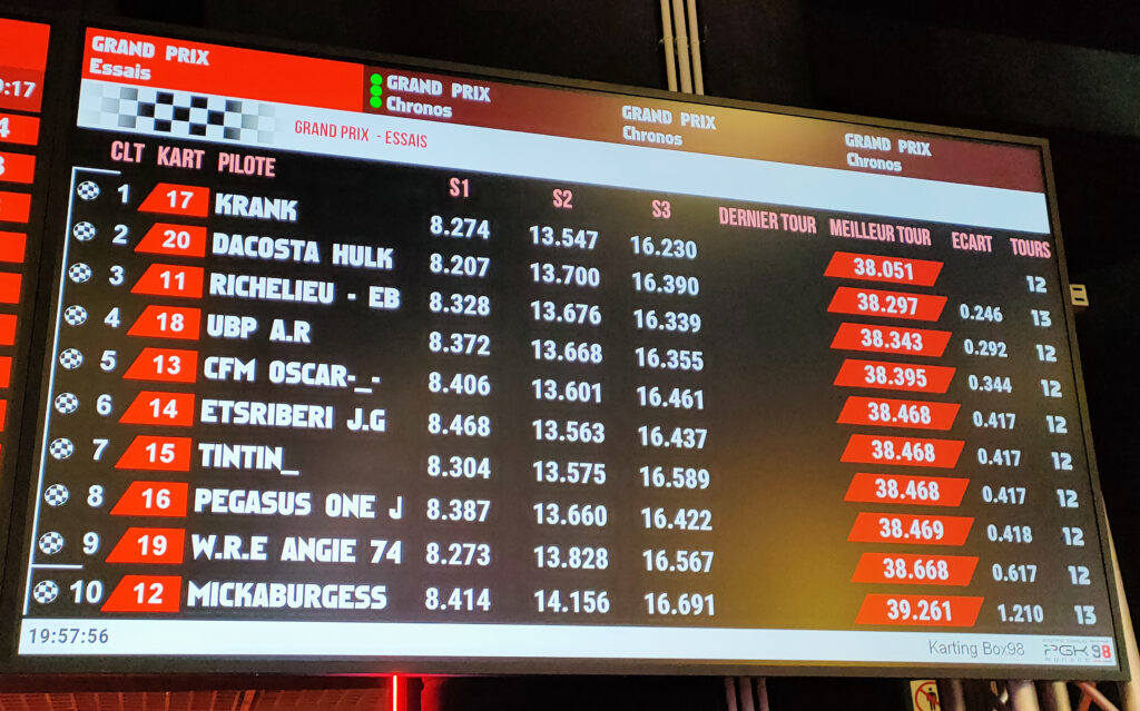 On connaît désormais les trois nouvelles formations qui vont intégrer la finale de la 1ère Monaco Corporate Cup de Karting, fixée au mardi 3 mars. Depuis dix jours, sept équipes avaient déjà gagné leur place, étant arrivées premières lors de leur soirée de qualification respective. Jeudi dernier, les équipes classées deuxièmes (ainsi que les trois meilleurs temps des troisièmes) se sont affrontées sur le circuit BOX98. La compétition a été indécise car le classement se fait à l’issue de l’addition des points liés au classement obtenu par les trois coureurs de l’équipe. D’autant plus qu’un bug informatique, sans doute lié au match de basket disputé simultané au stade Louis II, est venue perturber temporairement le bon déroulement des courses. Lors des essais, qui prennent en compte le meilleur temps au tour, cela n’a pas empêché quatre pilotes de n’être séparés que par deux millièmes de seconde lors d’une même course de qualification !